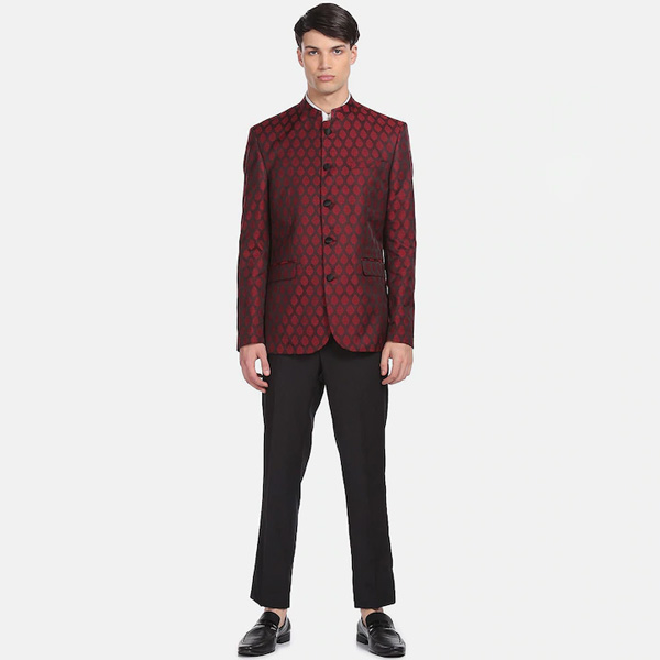 Maroon printed regular-fit blazer, has a mandarin collar, long sleeves, button closure, a welt pocket at the chest, an attached lining, double-vented back hem